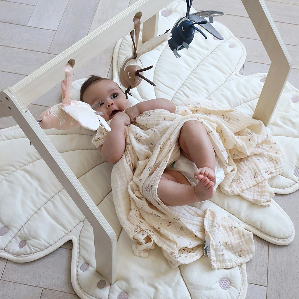 The bumble bee activity toy has fun crinkle textures, mirrors, ribbons, and a small jingle bell, sure to arouse the baby’s curiosity and stimulate its senses.