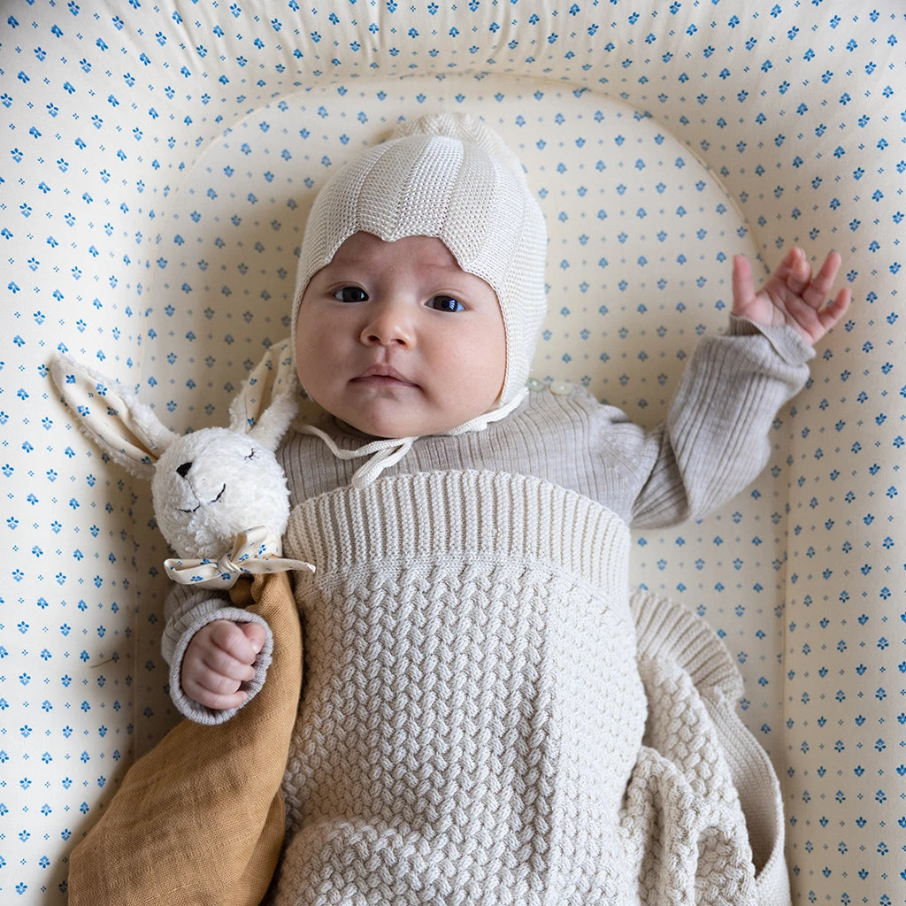 Always place the nest on a flat surface. Baby Nest in white and blue shades.