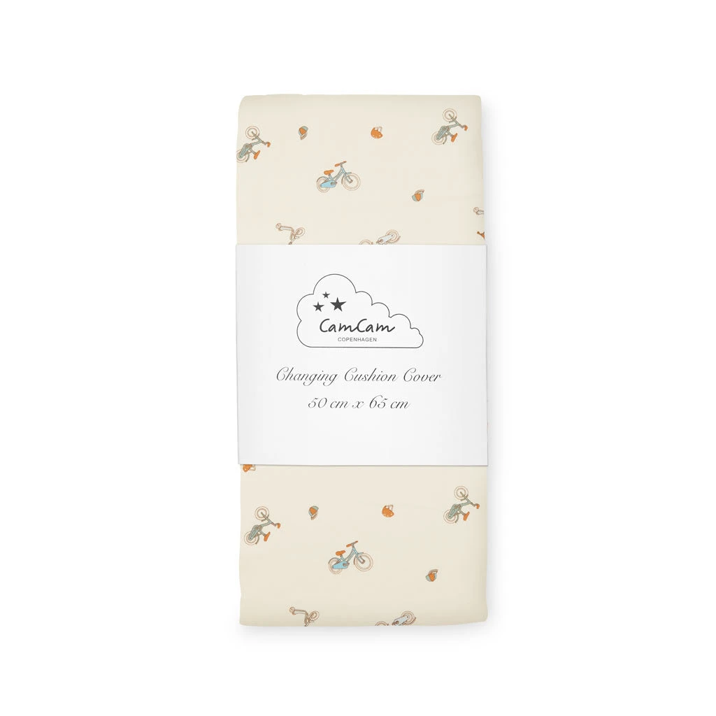 Changing Cushion Cover in green, brown, and blue shades on a cream white background.