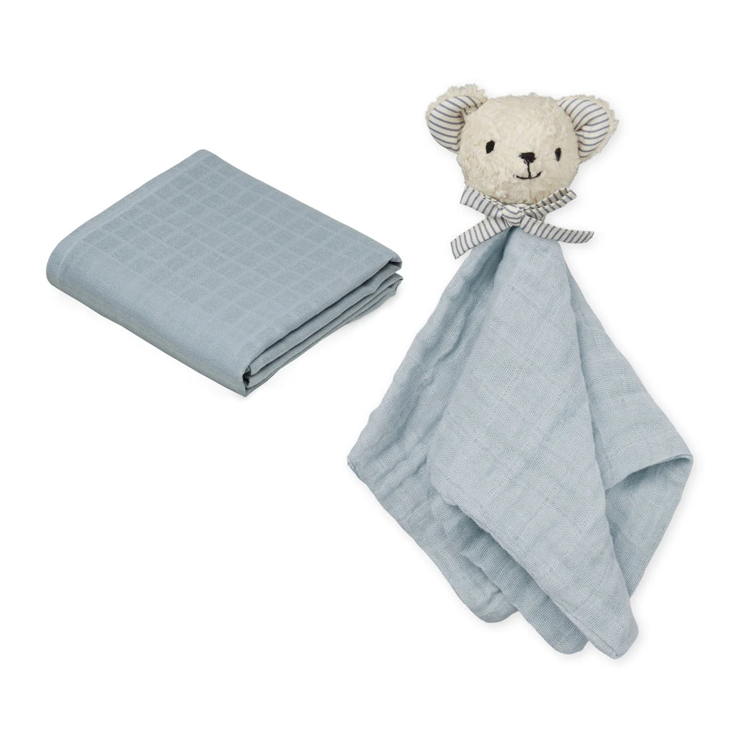 Beautifully printed Cuddle Cloth Gift Box offering a pair of bestselling baby must-haves; 1 Bear Cuddle Cloth and 1 Muslin Cloth.