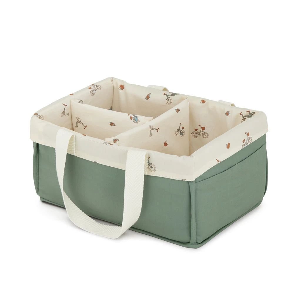 Diaper Caddy in green, brown, and blue shades on a cream white background.
