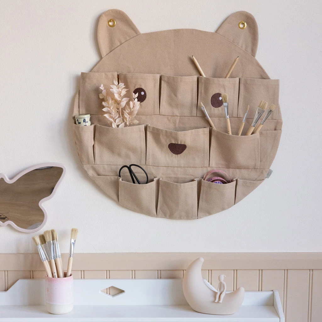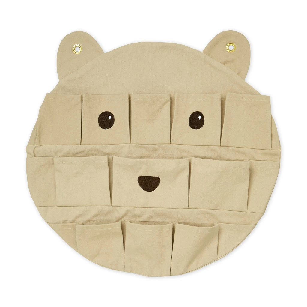 Adorable bear faced wall organizer offering versatile storage for all the small toys, books, and accessories.